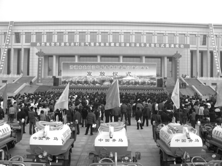 新华网河南频道12月24日讯 大河网-河南日报农村版报道: 近日,济源市隆重举行了农村沼气服务体系建设“奔马”牌沼气服务车发放仪式。济源市有关领导和11个乡镇的领导,农业服务中心、沼气建设重点村负责人等400余人参加了仪式。