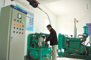 在养猪场,技术员向记者演示了纯沼气发电过程,一台40kw发电机用管线连着沼气池,推上发电闸刀,发电机发出“轰隆隆”的声音,380伏三湘电输送了出来,据市农村能源办主任李可克介绍,这套大型沼气综合利用设备属全国领先技术,每年可产沼气17.52万m3,可发电26.95万度,每年可节省标准煤357吨,封山育林1601亩,沼液可灌溉农田1600亩,减少COD排放量303.84吨,减少二氧化碳排放455.5吨,投资回收期为8.3年。