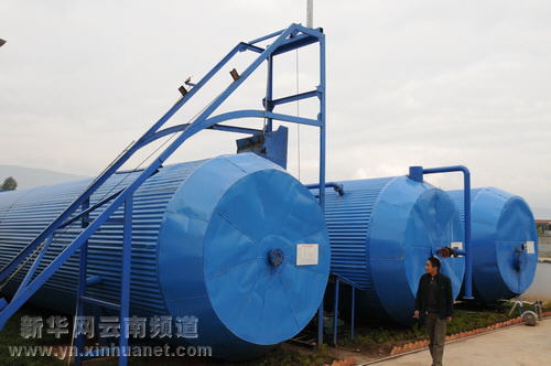 12月4日,在云南省大理白族自治州洱源县,一名工作人员在太阳能中温沼气站里走过。 云南大理洱源县乳牛养殖产业每年能产生粪便60多万吨。为了解决牛粪污染问题,洱源县引进太阳能中温沼气发酵技术,在县内建设了几个太阳能中温沼气站,减少和杜绝了粪便乱堆乱放现象,改善了农村卫生状况。 新华社记者 蔡祥荣 摄