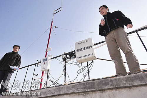 荆楚网消息 (楚天都市报) 猪粪便变成有机肥和沼气,养猪场不再臭气熏天。昨日,长江中下游首个“低碳养猪”示范工程在江夏梁子湖畔竣工。据介绍,该工程由世界自然基金会资助,每天可处理粪便80吨,日产沼气150立方米,不仅减少了粪便直排对梁子湖的污染,而且利用了废弃物的可再生价值,每年的温室气体减排量相当于2万亩森林一年吸收二氧化碳的总量。图为养猪场安装的气象监测系统,严密监控产生的温室气体。 记者陈勇 通讯员杨曼