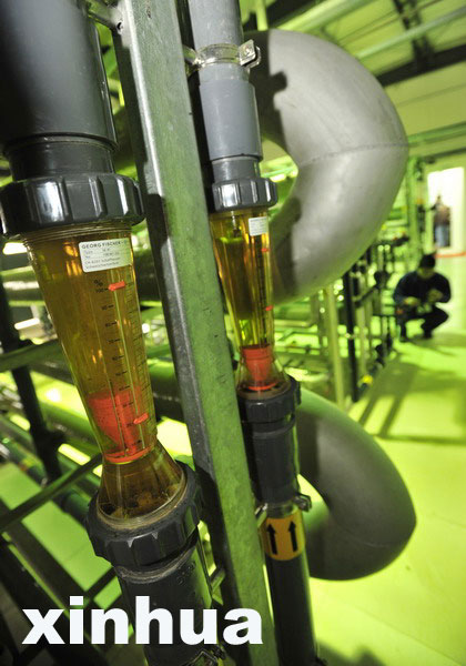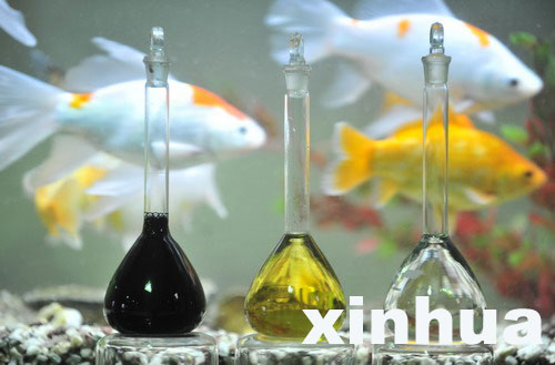 3月12日在武汉市陈家冲垃圾填埋场拍摄的经过3次处理的水样,处理后的水可用来养鱼。陈家冲垃圾场采用了一系列先进的设备和技术,在处理垃圾的过程中注意保护周边环境,并对同时产生的沼气等再生能源加以利用。垃圾场每天处理垃圾2000吨,占武汉市全市垃圾的1/3。周超 摄