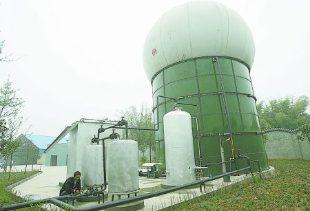 凤凰村的农民集中居住区附近,记者很容易就找到了集中供气站的球形建筑。“这个月20号,就要开始向农民集中居住区供气,所有设备正在进行最后的调试。”双流县能源办工作人员张晓东介绍,“这还是一个试点项目,规模不算大,秸秆的日消耗量是500公斤,每天可产生300立方米的沼气,足够凤凰村安置点的250户农户使用。”