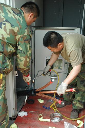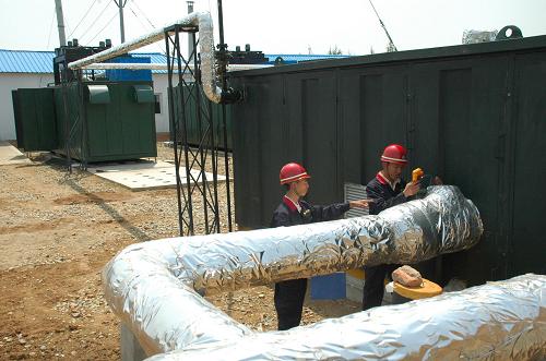5月28日, 黑龙江省牡丹江市郭家沟垃圾填埋气发电厂工程技术人员正在连接电厂输出电缆。新华社发(张春祥 摄)