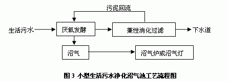 生活污水中大部分有机物经厌氧发酵后产生沼气,发酵后的污水进入兼性消化过滤池,部分未分解的有机物得到进一步降解。沉淀下来的部分有机质和活性污泥回流到厌氧发酵池内提高厌氧发酵的效果,将达到净化处理的目的。