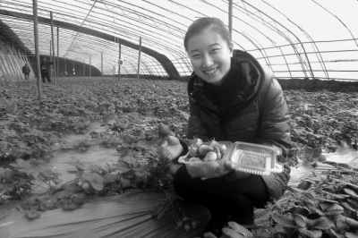 在山东省淄川区将军路街道慕王社区依托大型沼气工程,慕王社区因地制宜发展都市农业,新建10个自动化温室大棚,沼液、沼渣施肥,发展草莓种植采摘。高品质的草莓,吸引众多市民前来采摘。图为圣樵农耕园里一名市民正在采摘草莓。